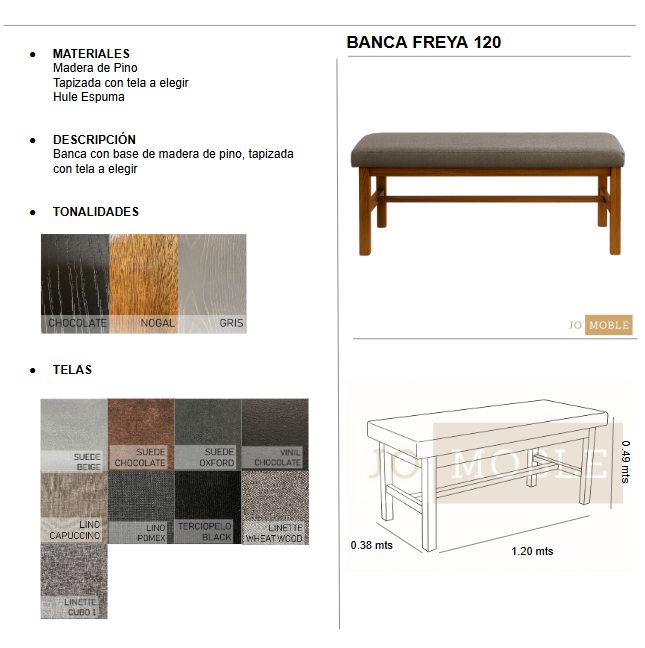 La Banca Freya fabricada con madera de pino y tapizada en tela con acojinamiento de hule espuma.