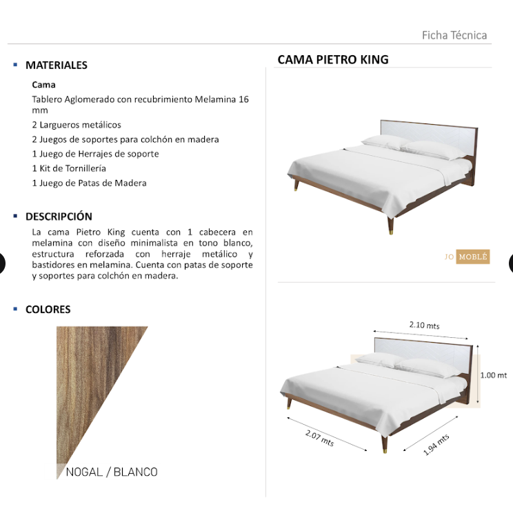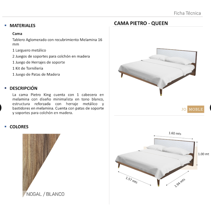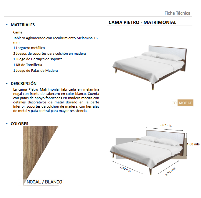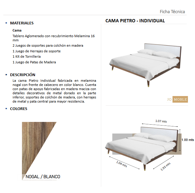 Esta cama Pietro está ensamblada por una estructura en melamina con colores blanco y nogal.