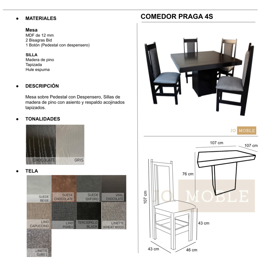 Las sillas Praga cuentan con una estructura de madera de pino, respaldo y asientos acojinados en hule espuma y tapizados en la tela que más se adapta a tus necesidades y estilo.
