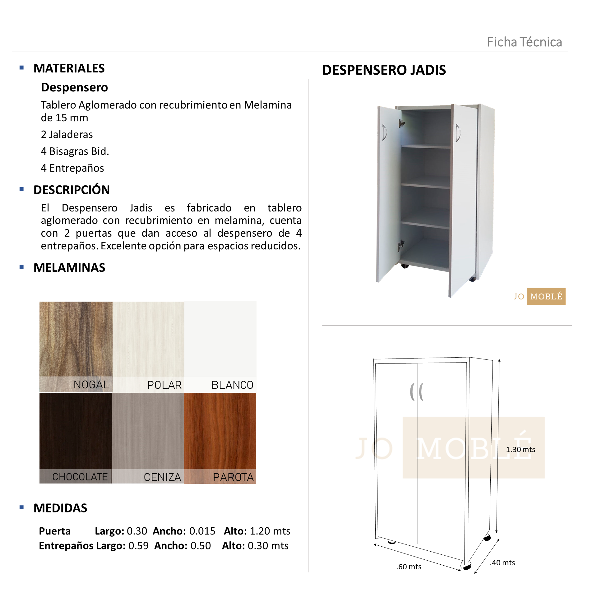 El despensero es adaptable y de fácil desplazamiento. Cuenta con 4 entrepaños