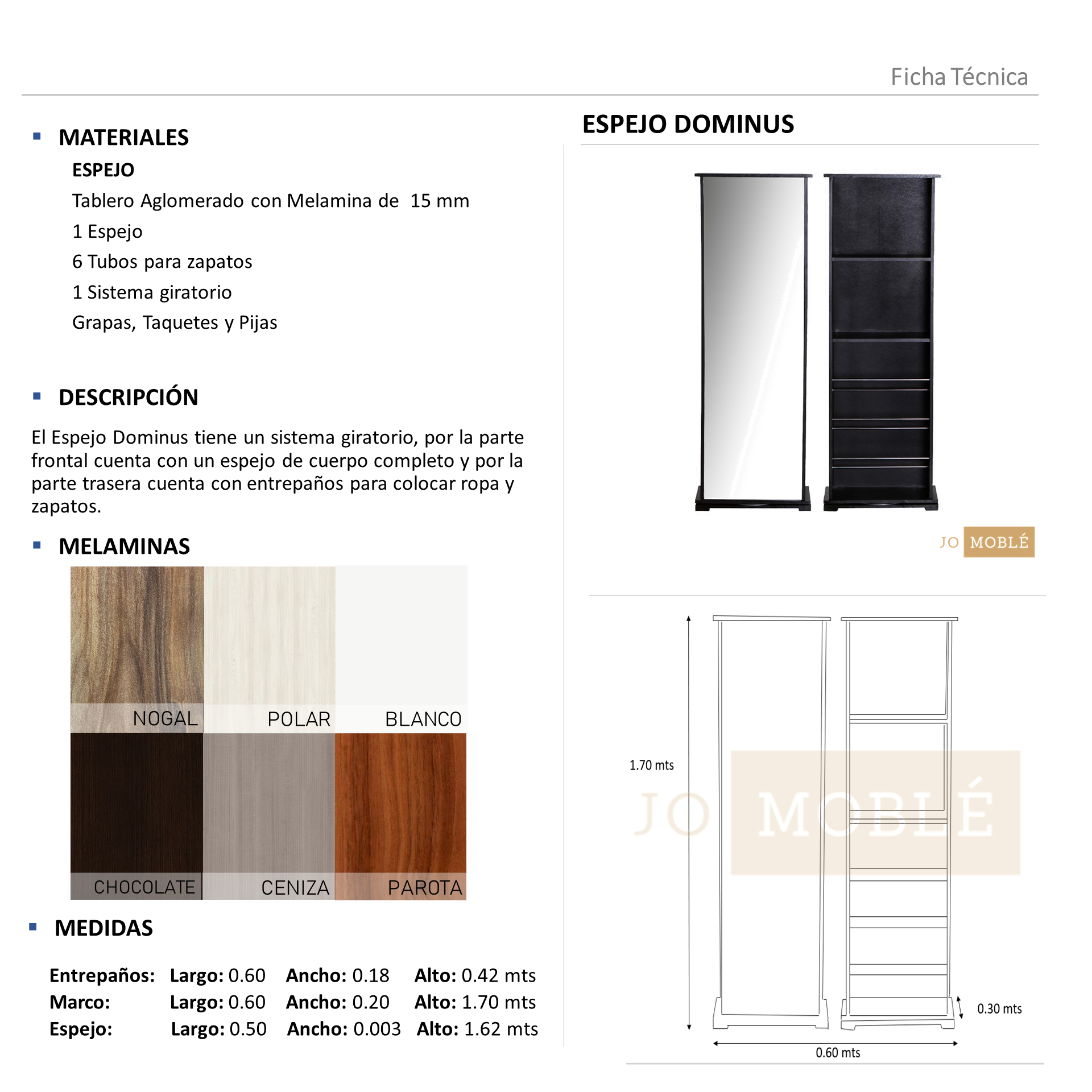 El sistema giratorio del Espejo Dominus de cuerpo completo, da acceso a un pequeño almacenaje de calzado, repisas para poder acomodar perfumes, productos para el cuidado de la piel, entre otros...
