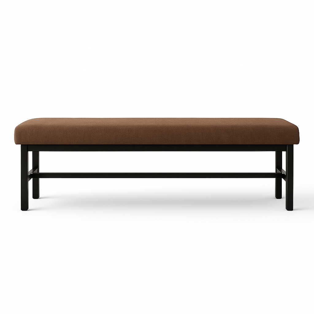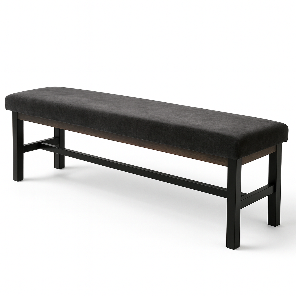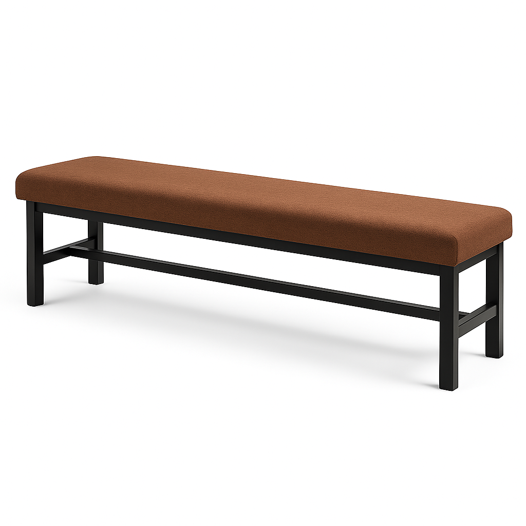 La Banca Freya fabricada con madera de pino y tapizada en tela con acojinamiento de hule espuma.