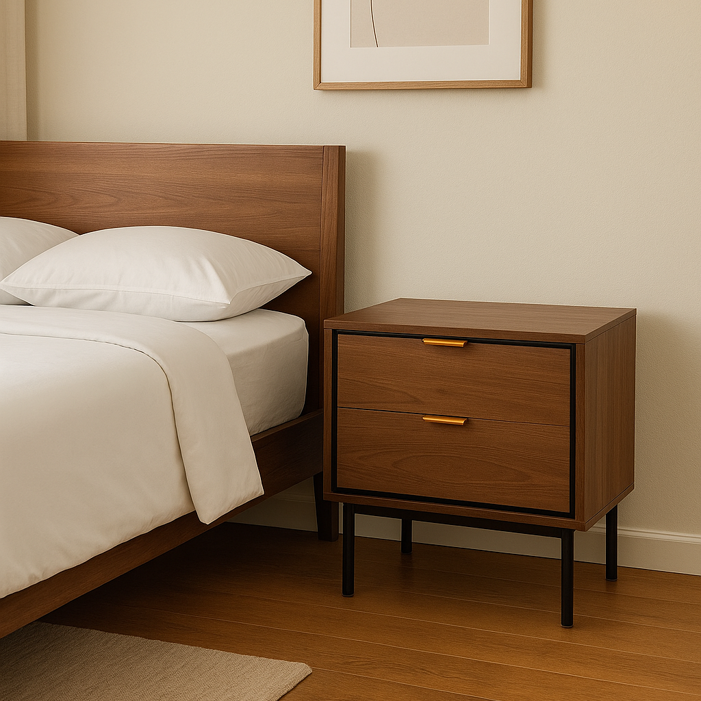 Buró con diseño innovador y líneas modernas, ideal para recámaras contemporáneas.