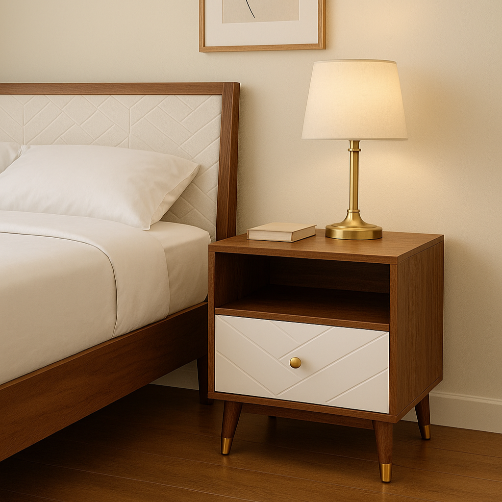 Con sus elegantes patas de madera con color oro y su excelente espacio en cajón y entrepaño.
